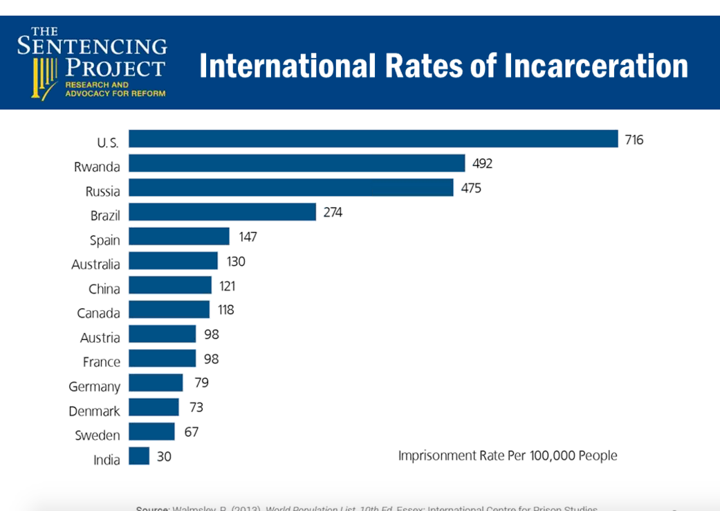 Over the past four decades, there have been more than a million individuals added to the prison population — this is mass incarceration. As a country, the United States, imprisons 5x – 6x as many citizens as other countries.
