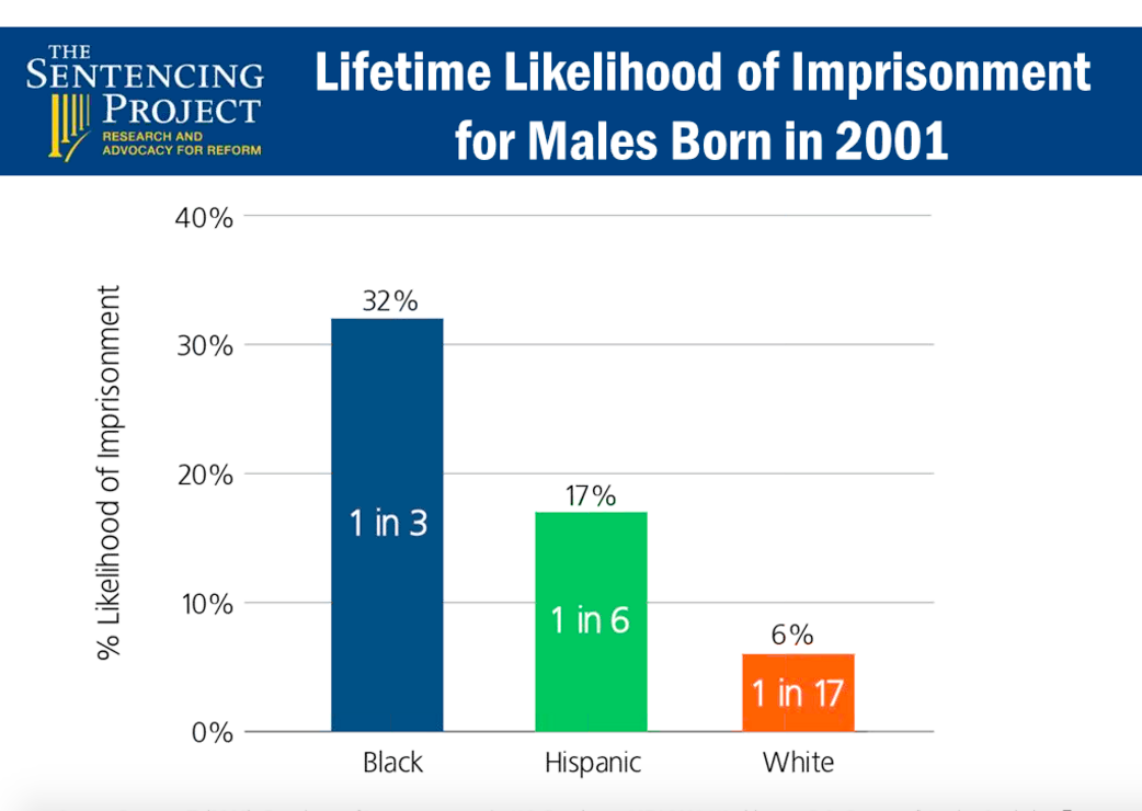 The rates of imprisonment are not equal across ethnic groups. As of 2001, an African American man has an 1 in 3 chance of facing jail time at some point in his lifetime. A Hispanic man has a 1 in 6 chance of facing jail time at some point in his lifetime. Both statistics are much lower than those of their Caucasian counterparts.