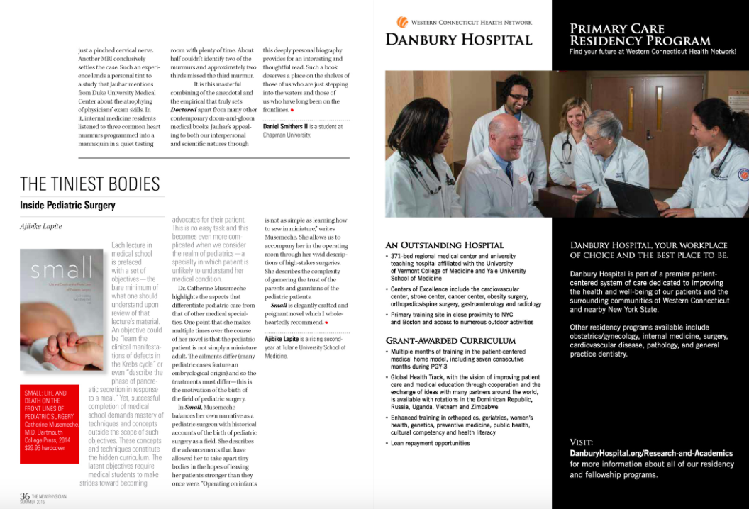 A few months ago, I was asked to review Catherine Musemeche’s novel, Small: Life and Death on the Front Lines of Pediatric Surgery for The New Physician. I’m pleased to let you all know that you can find my review in the current issue of The New Physician.